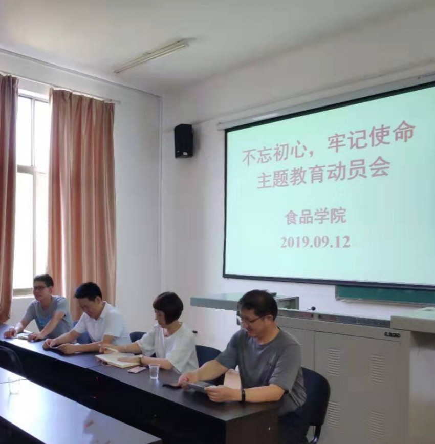 2019年9月12日下午,食品学院党员在院党委书记范云的带领下,开展了“不忘初心、牢记使命”主题教育学习会,深入学习习近平总书记在“不忘初心、牢记使命”主题教育工作会议上的重要讲话精神,以及校党委书记黄路生在校“不忘初心、牢记使命”主题教育工作部署会上的讲话精神,并对学院开展“不忘初心、牢记使命”主题教育进行动员部署。范书记要求,学院主题教育要牢牢把握“守初心、担使命,找差距、抓落实”总要求,牢牢把握深入学习贯彻习近平新时代中国特色社会主义思想,要在省委和校党委的统一决策部署下,结合学院实际,制定切实可行的工作方案,全面落实主题教育各项工作任务。学院各支部和全体党员要充分认识开展主题教育的重大意义,结合工作实际,围绕中心,服务大局,进一步增强“四个意识”、坚定“四个自信”、做到“两个维护”,以推进有特色高水平大学的建设。