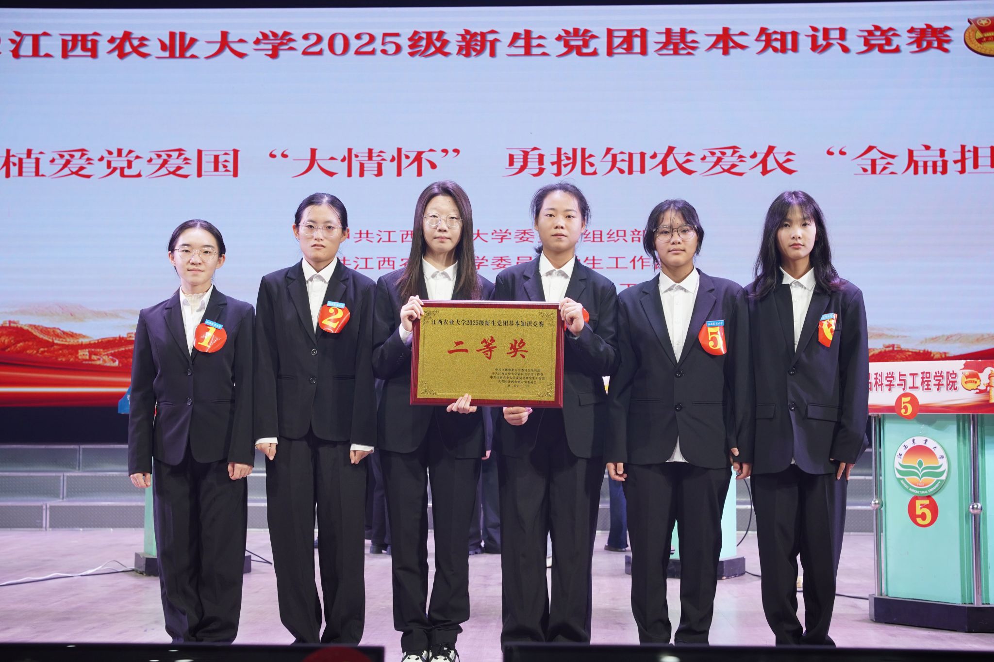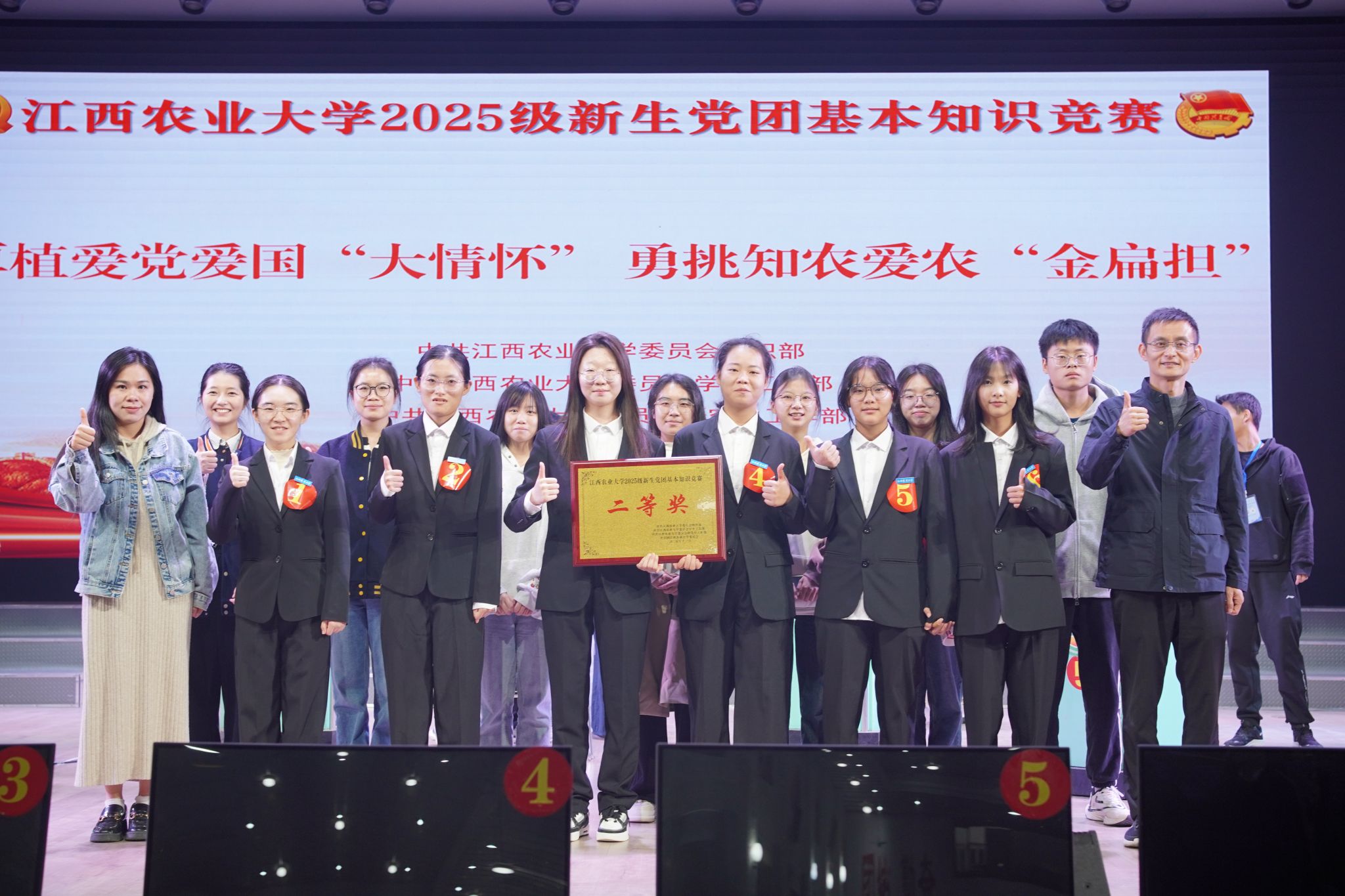 11月11日,江西农业大学2025级新生党团基本知识竞赛决赛在校大礼堂隆重举行,食品院6名2025级学生(许晶晶、李曾玥、吴沛玲、黄惠敏、郭钰妍、林怡)代表学院参赛。她们一路过关斩将,最终以第2名的优异成绩斩获二等奖殊荣!