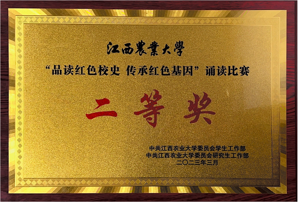 316日晚,由中共江西农业大学委员会学生工作部、中共江西农业大学委员会研究生工作部主办的品读红色校史 传承红色基因诵读比赛在学校大礼堂举行,我院选派节目《乾乾先贤 巍巍江农》参赛,经过激烈角逐,荣获第三名、二等奖。