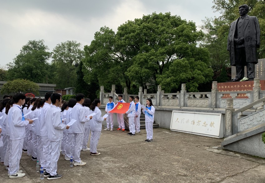 在方志敏烈士雕像前,团员代表蔡雅馨带领团员们重温入团誓词,并作了团旗下的演讲,介绍了方志敏烈士的生平事迹,表达了团员青年传承革命精神、报效祖国的坚定信念。学生党员和团员们饱含深情齐声诵读方志敏的《可爱的中国》。随后,师生们在院党委书记范云的带领下来到方志敏烈士墓前,开展了敬献花圈、默哀致敬、绕墓一周等仪式。最后,师生们参观了方志敏烈士事迹陈列室,进一步学习了方志敏同志的生平功绩和被捕后坚贞不屈的英勇事迹。