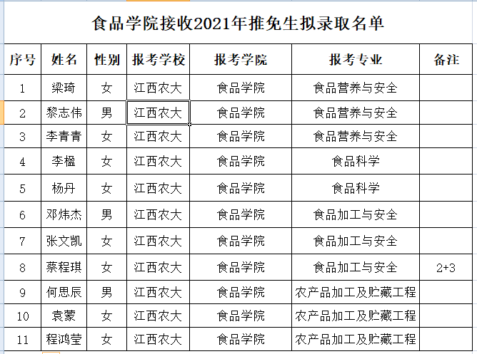 根据学校《江西农业大学推荐优秀应届本科毕业生免试攻读硕士学位研究生实施办法(修订)》(赣农大发【2020】号)文件精神,经学生本人申请,学院推免遴选小组面试考核,拟录取以下11名同学免试攻读硕士研究生,现将名单公示如下。若对拟录取结果有异议,请于2020年10月23日前,联系学院教学办刘老师(电话:83813420)。