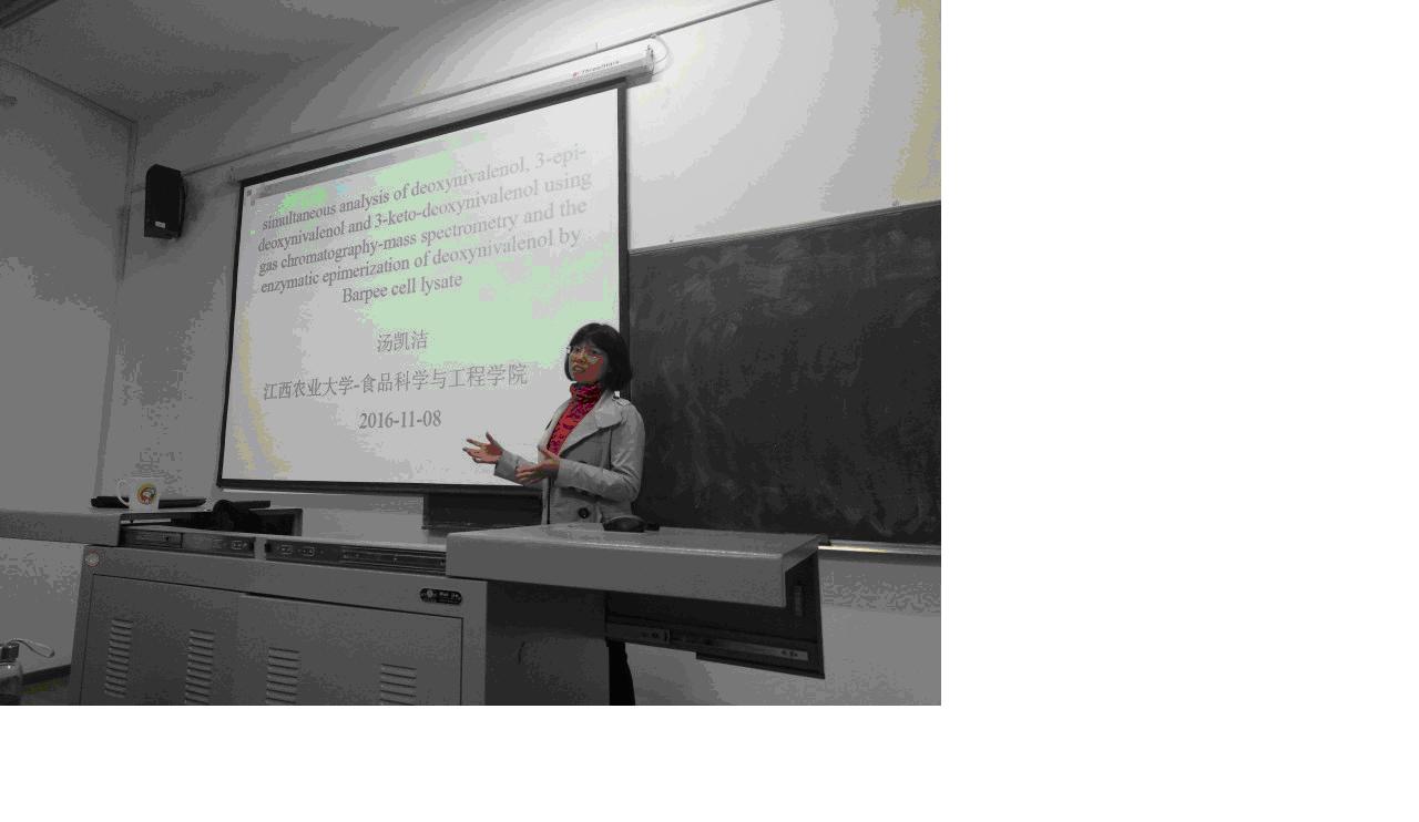 汤凯洁老师于2015.08-2016.08在加拿大农业部圭尔夫食品研究与开发中心(Guelph Research and Development Centre, Agriculture and Agri-Food Canada)进行了为期一年的博士后研究,主要从事真菌毒素检测与降解领域的研究。在本次报告会中,汤凯洁老师重点介绍了真菌毒素脱氧雪腐镰刀菌烯醇(deoxynivaleno,DON)(又名呕吐毒素,Vomitoxin)在农副产品中的污染与危害现状、DON及其代谢物 (3-epi-脱氧雪腐镰刀菌烯醇)和 (3-keto-脱氧雪腐镰刀菌烯醇)的气象色谱-质谱联用检测方法的建立以及利用微生物分泌的异构化酶降解DON的特性等三方面研究内容。据报道,随着全球气候变化,DON毒素已成为目前危害人畜安全的重大挑战之一。汤凯洁老师的报告为我院在真菌毒素研究方面开拓了新的研究思路和检测方法。